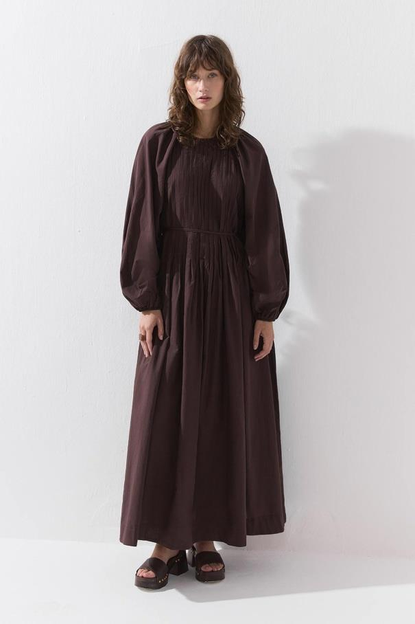 •%100 Pamuklu vual özel kumaştan üretilmiş, bisiklet yaka, kendi kumaşından biye kemerli, arkadan gizli fermuarlı, kolları lastikli, ön ve arkası sık pile detaylı, rahat kalıp, kendi kumaşından astarlı, pamuklu vual elbise.