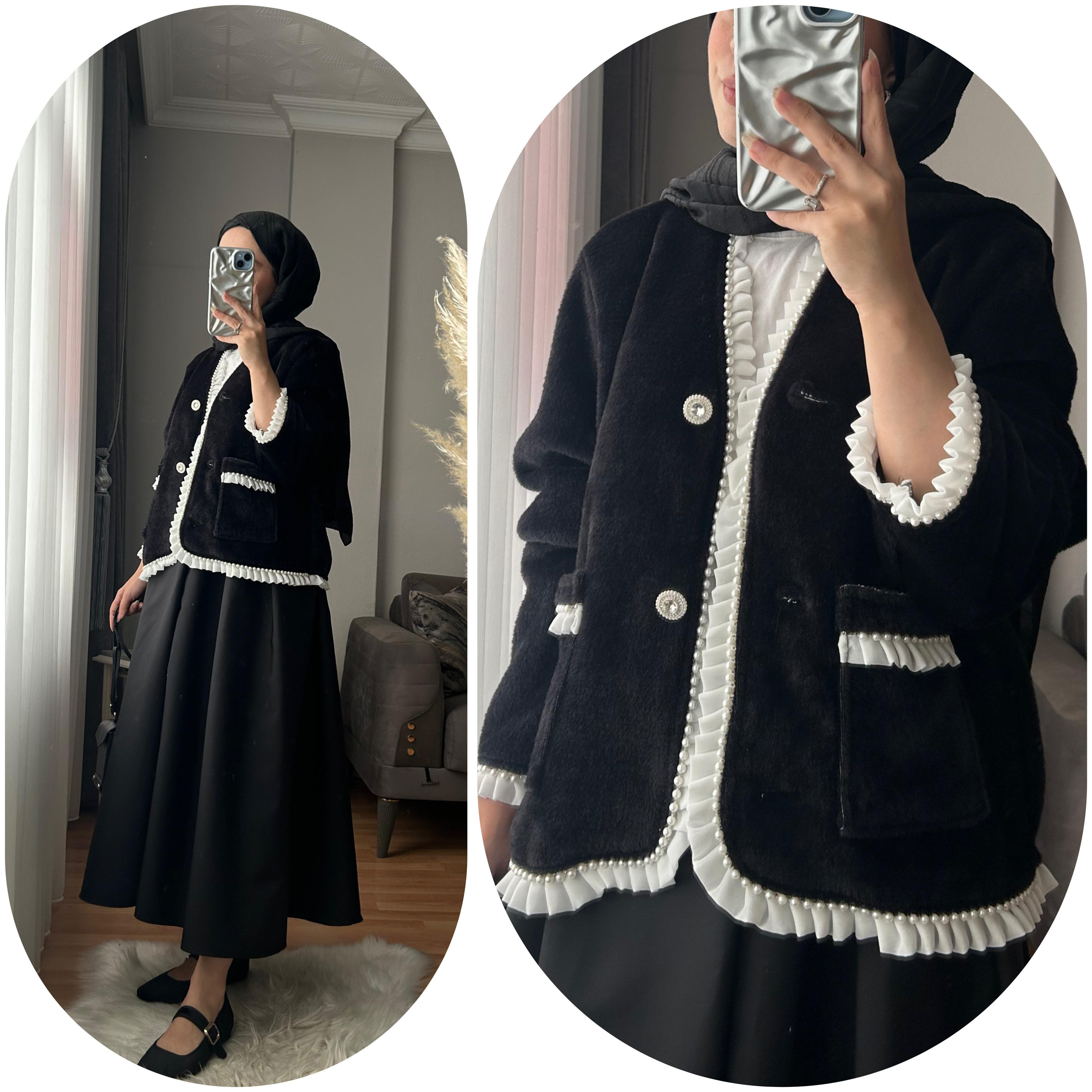 İnci Şerit Detaylı Kürk Ceket•Siyah
